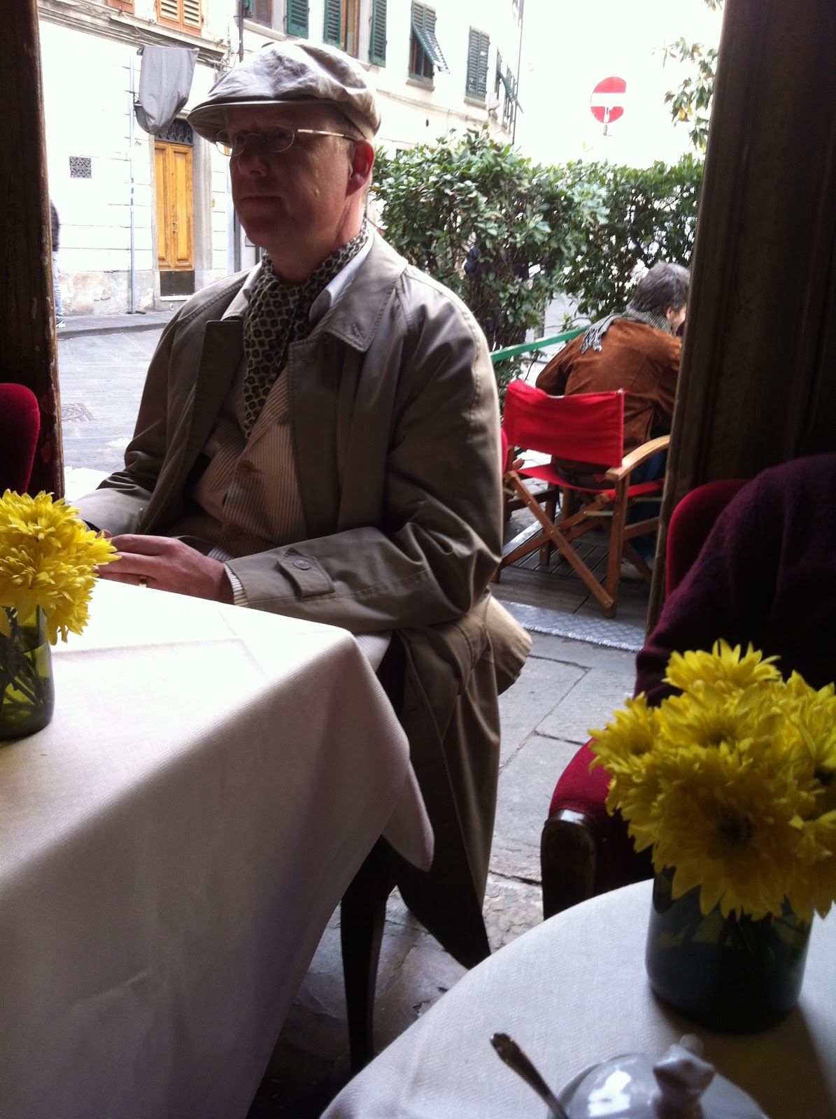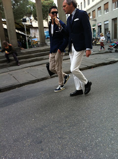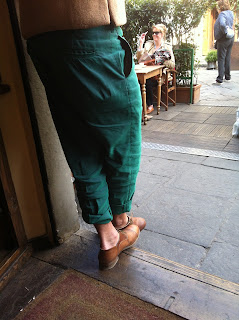 I was just having a casual drink at a near by café near the Duomo in Firenze, Italy. So, my dad ordered a compari soda and I got a succa de frutta di pera (which is my go to drink). But the main focus here is how this German gentleman walks into the café with a down coat, a vest, a button shirt, a scarf and the accessories...... The big glasses and the mail boy hat. Just fantastic......... |